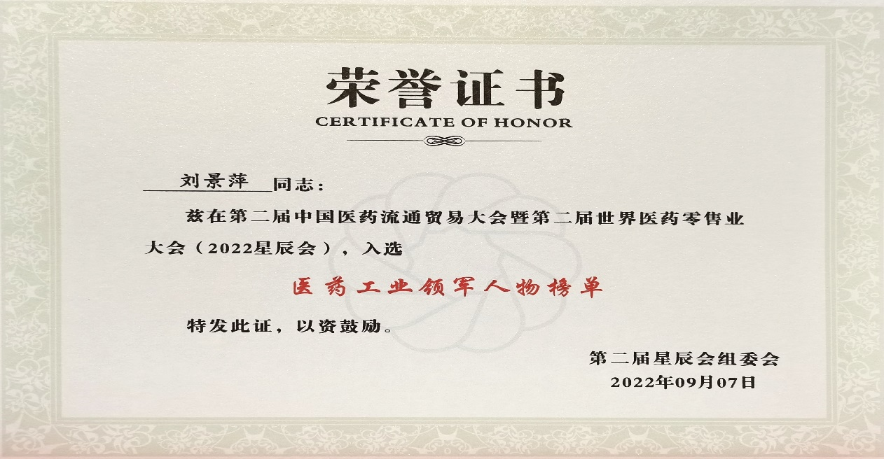 本次星辰会期间,尊龙时凯斩获颇丰,获得多项行业奖项及荣誉。在开幕式上,刘景萍董事长荣获“医药工业领军人物”称号。